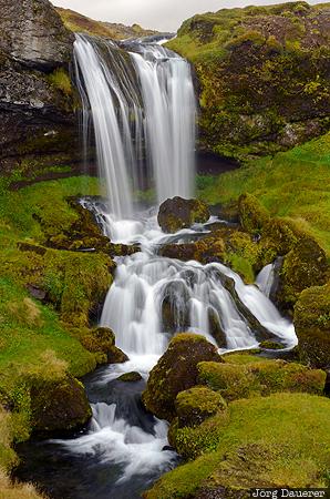 A beautiful multi-stage waterfall at the Snæfellsnes Peninsula surrounded by green mossy rocks. The Snæfellsnes Peninsula is in Vesturland, Iceland. This photo was taken at noon on a cloudy day in September of 2013. This photo is part of the exhibition Waterfalls of Northern Europe (Oct'14). This photo was taken with a digital camera.