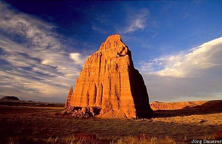 The lone sandstone rock "Temple of the Moon" in Cathedral Valley in the northern part of Reef National Park illuminated by warm evening light. Capitol Reef National Park is in southern Utah in the western part of the United States. This photo was taken at the end of a cloudy day in May of 2002.